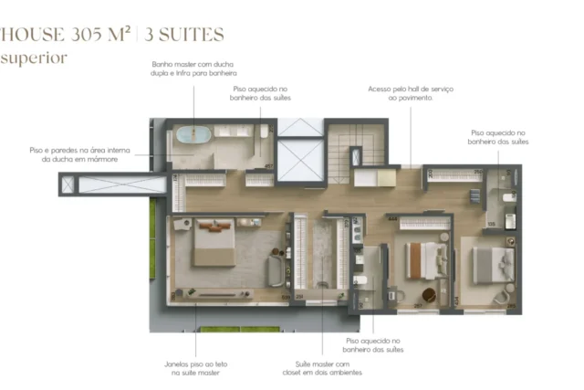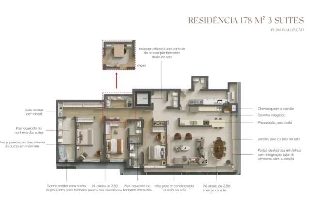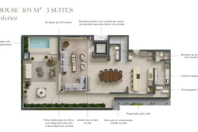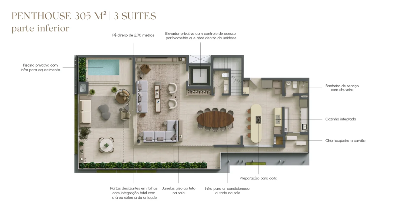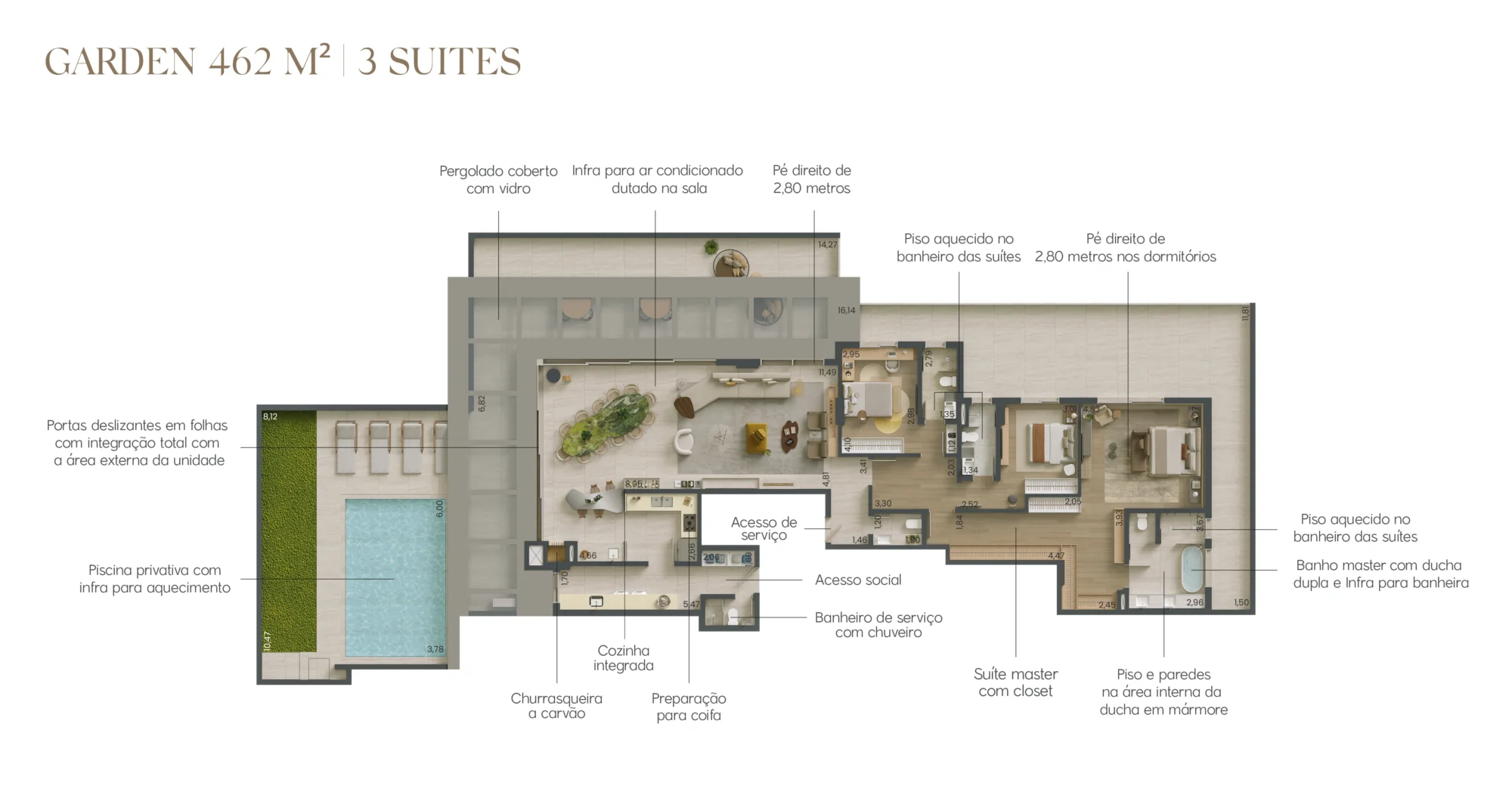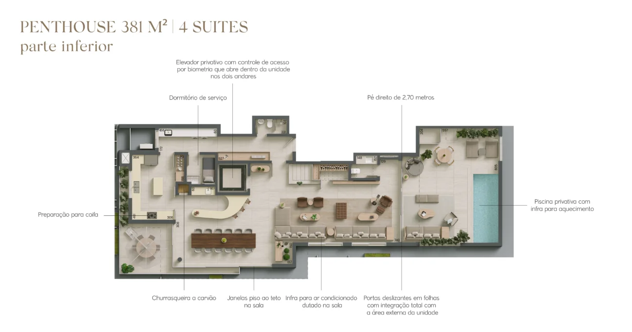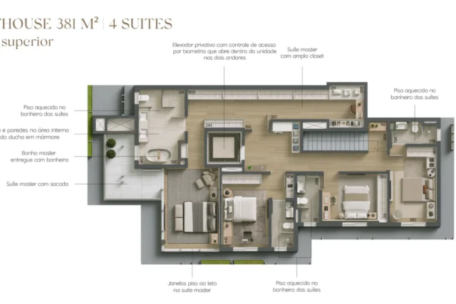 Com unidades tipo de 178 e 219m² com opções de 2 e 3 suítes, e gardens e penthouses de 305 a 462m² com 3 e 4 suítes.