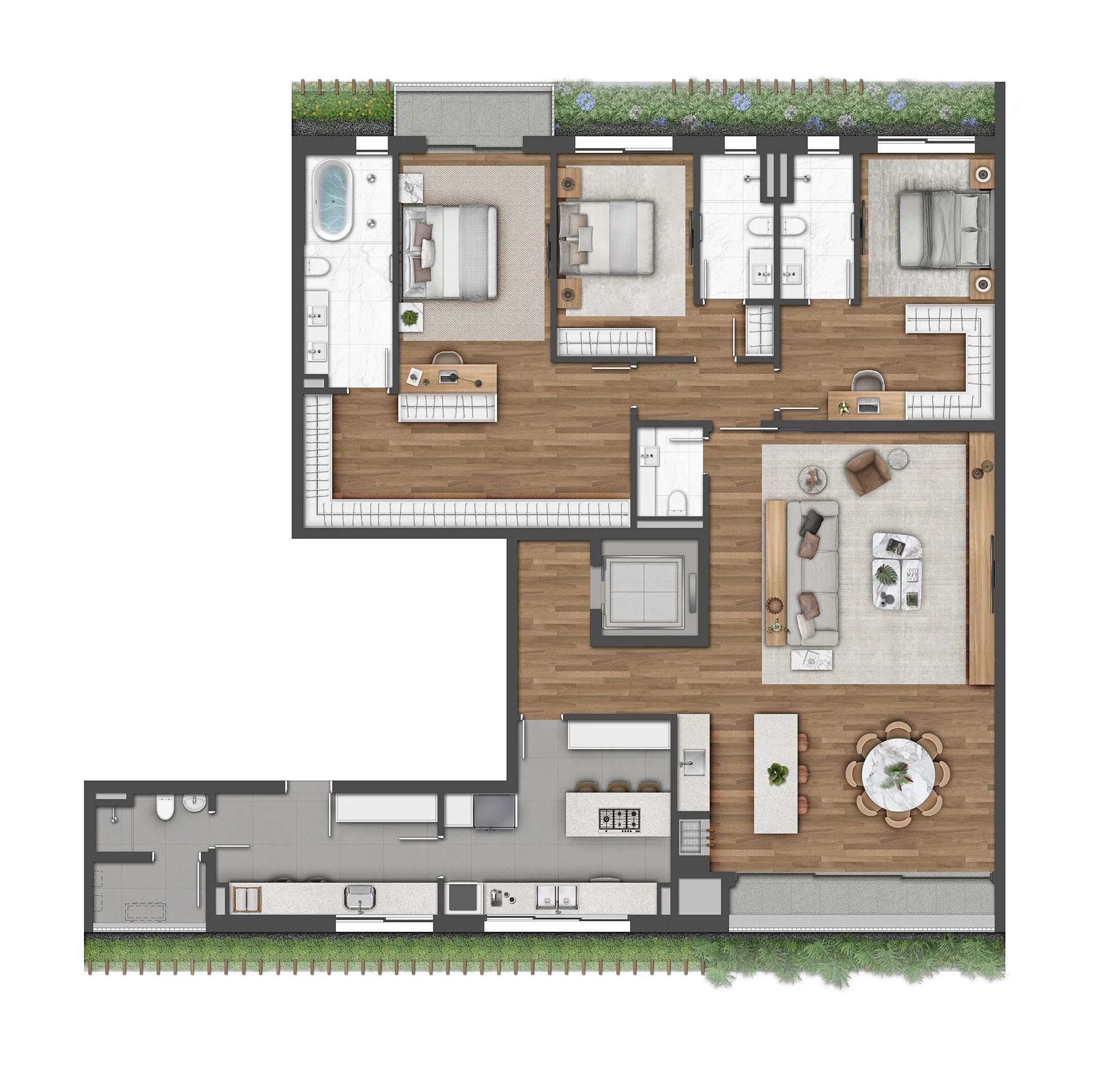 – Granito cinza nas sacadas e terraços