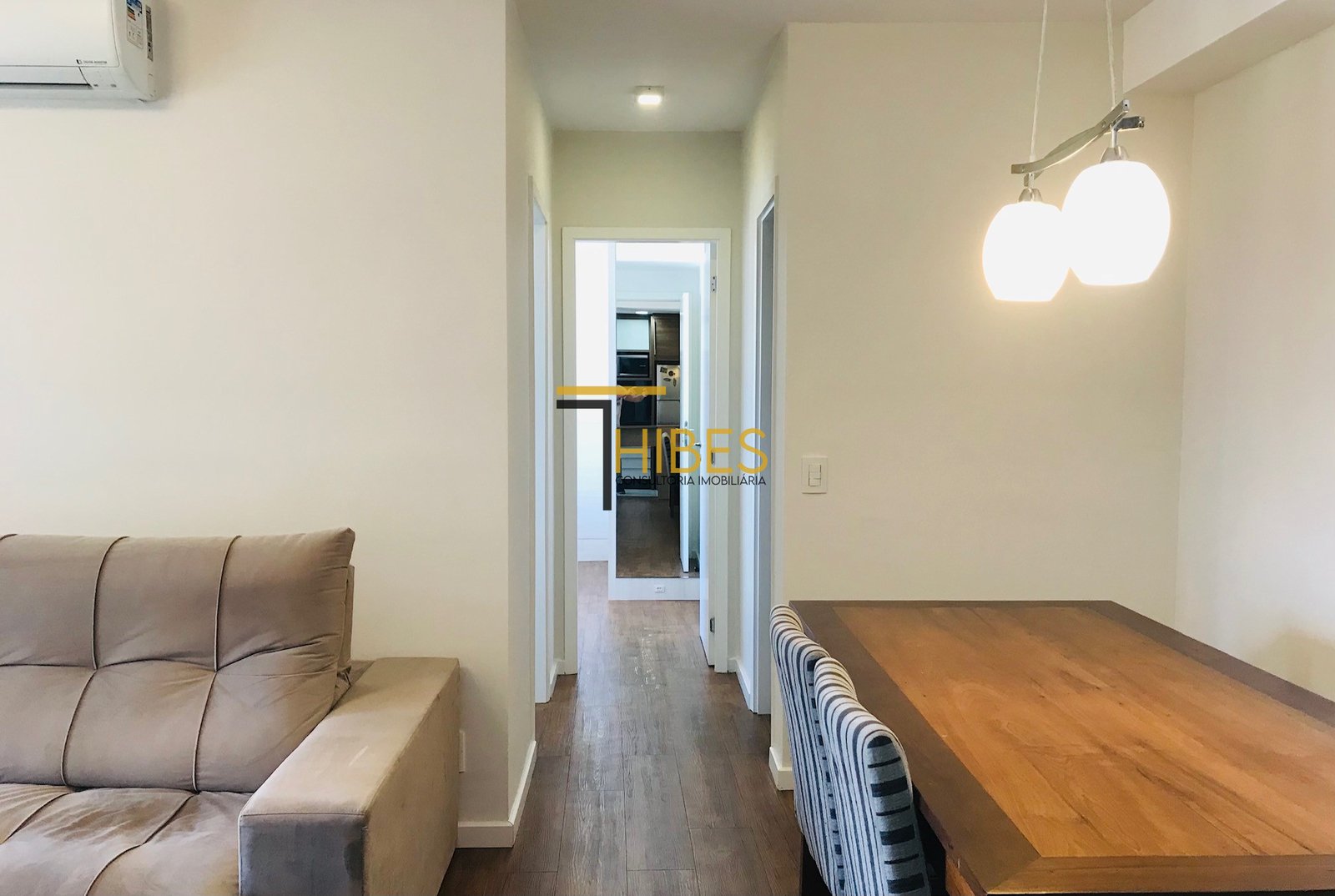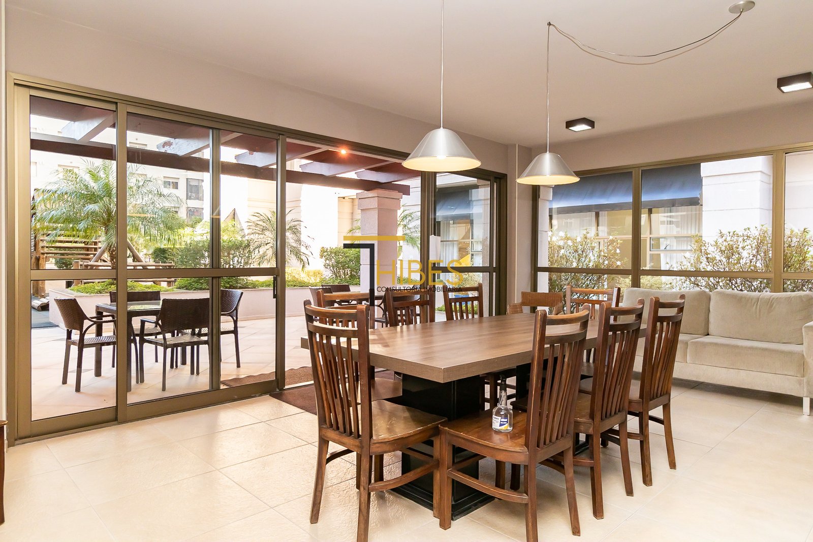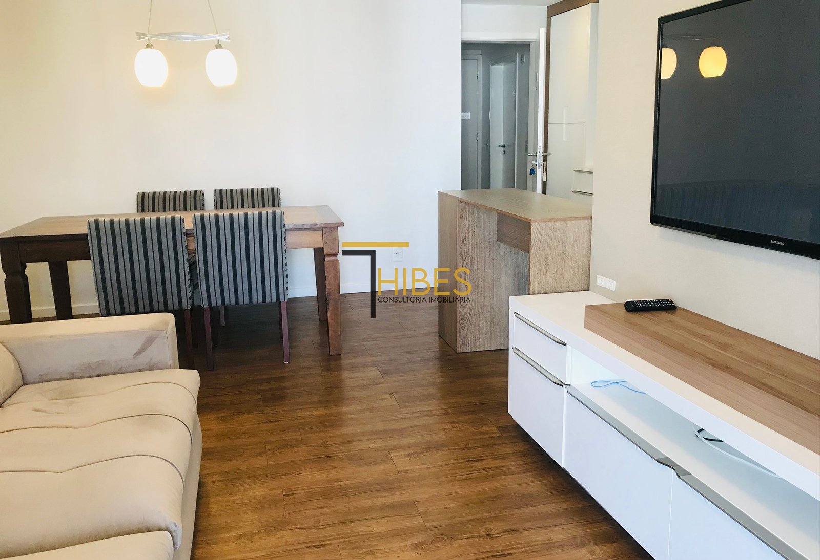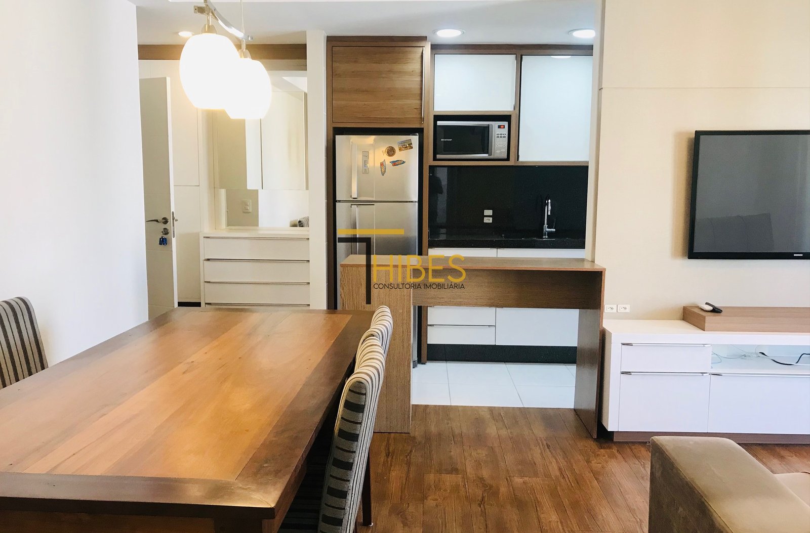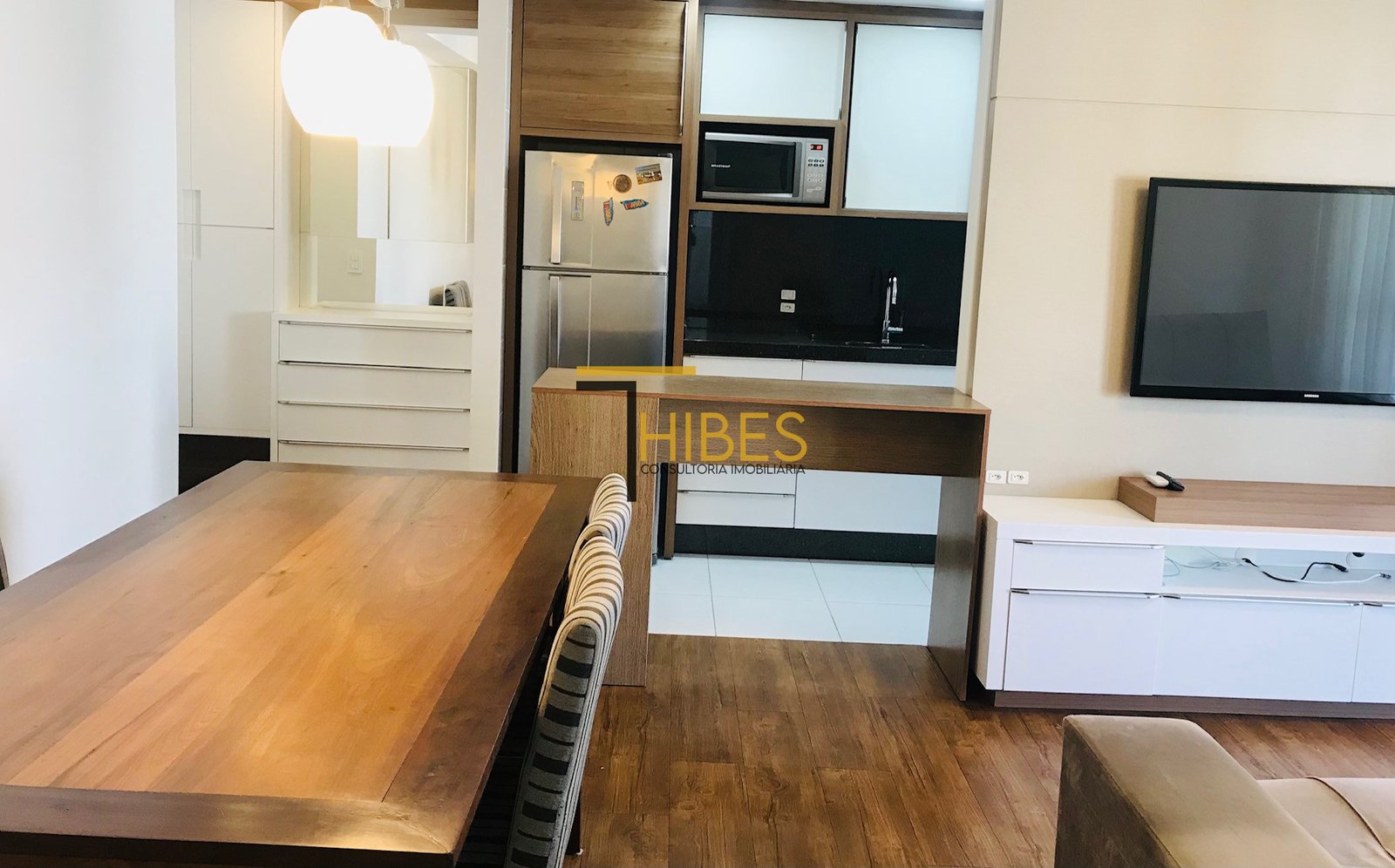 – Ampla sala de jantar com mesa- Sala de estar com sofá e painel para TV;
