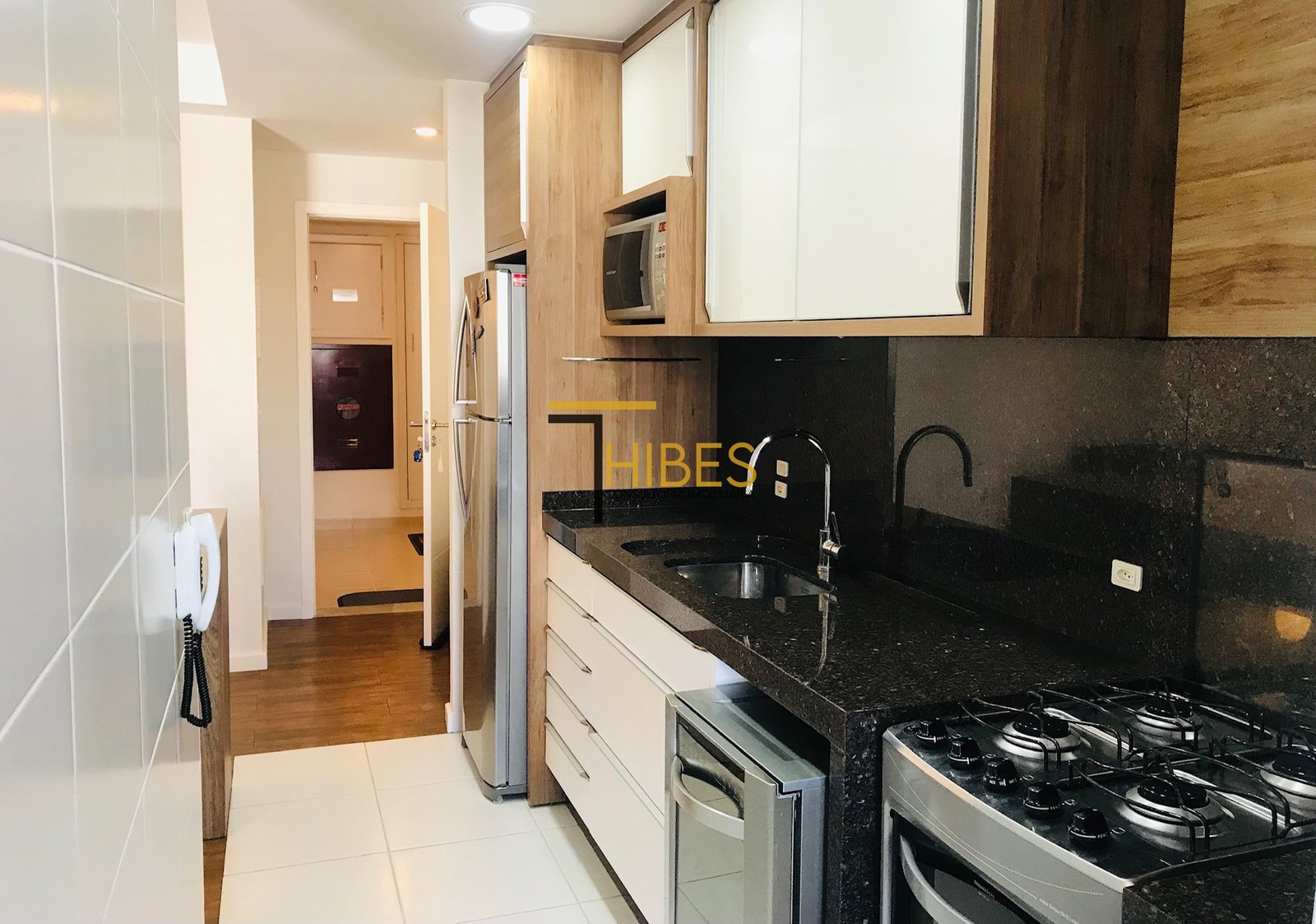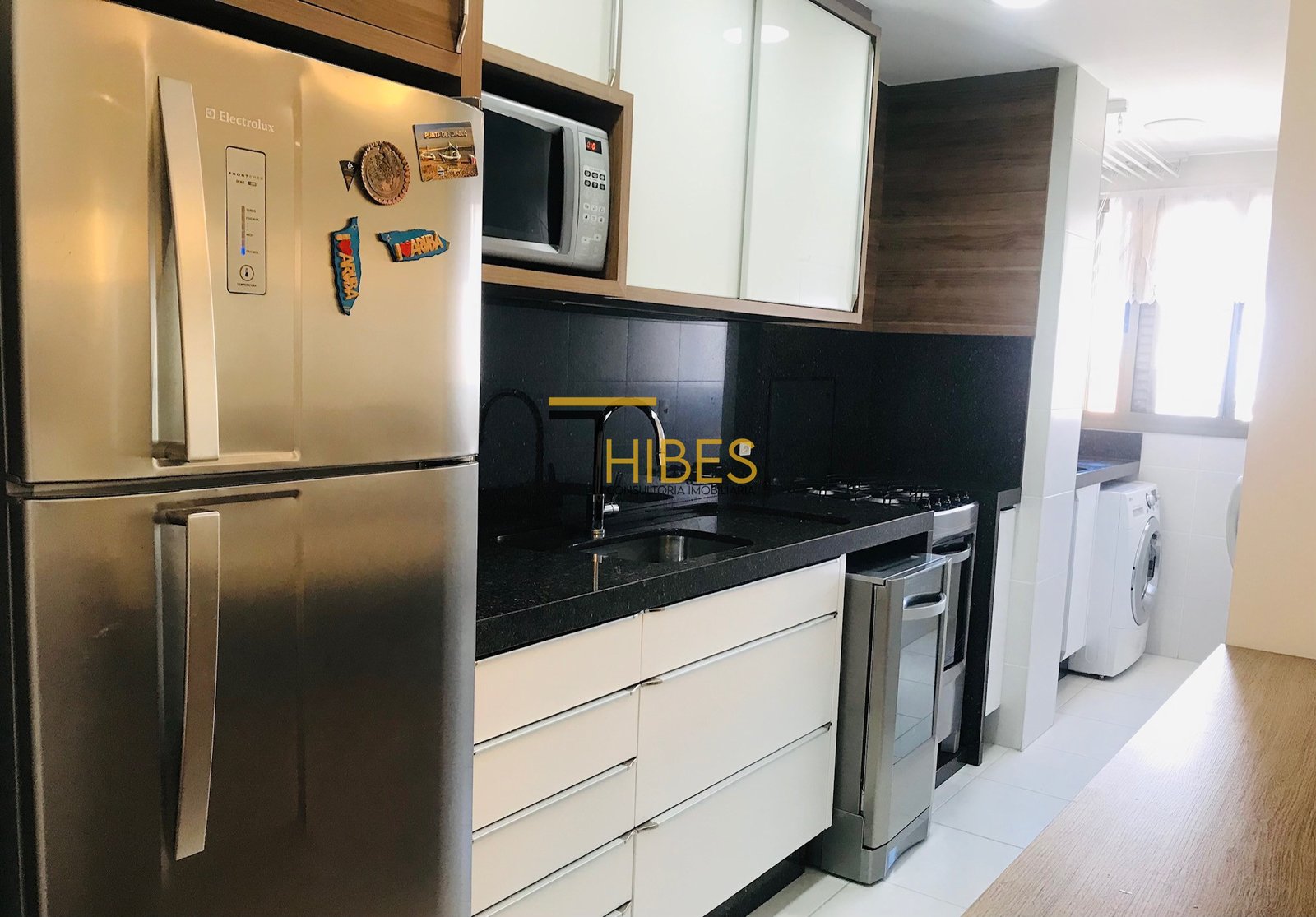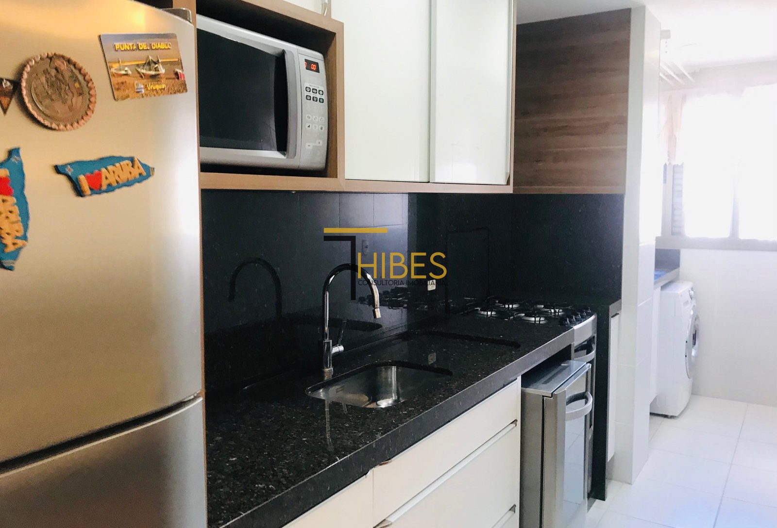 – Cozinha com móveis planejados, bancada em granito, fogão, coifa, forno;